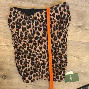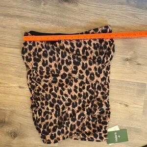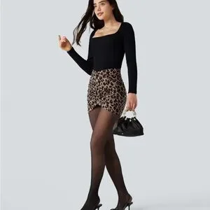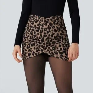Figure-hugging ruched mini skirt. Stretchy fabric with leopard print. High-rise fit with gathered detailing. Bold neutral tones for easy styling.