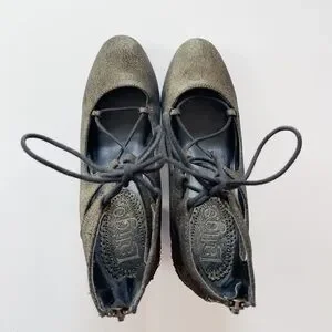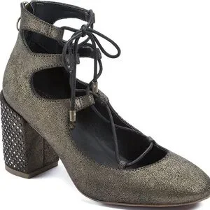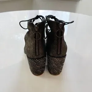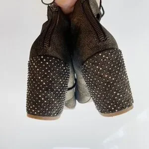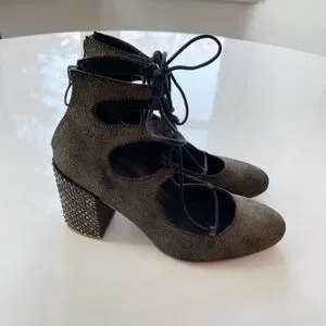 In beautiful pre-owned condition, no flaws! Only sign of wear is on the sole. Lace up front, studded block heel, fun metallic finish. Leather upper, manmade sole.