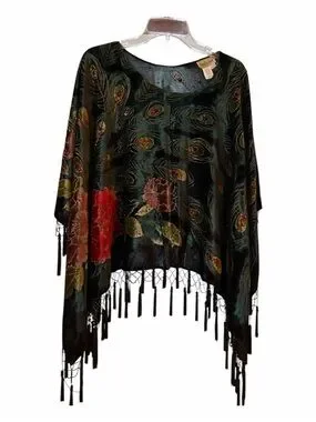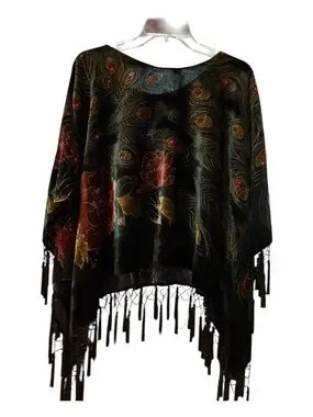 This item is a burnout velvet poncho featuring a peacock feather and floral design with beaded tassel fringe. Based on similar listings, it is often identified as a vintage or "whimsigoth" style piece from brands like Coldwater Creek.