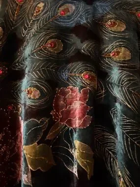 * Design: Features a dark teal or black velvet base with shimmering peacock feathers, vibrant red and purple floral motifs, and intricate beadwork.