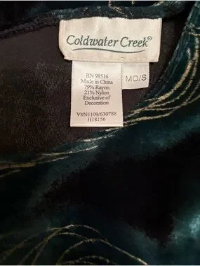 Soft velvet-like teal top with metallic gold embroidered swirl pattern. Rich color and subtle sheen. Elegant neckline detail. Versatile dressy piece.
