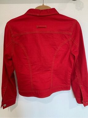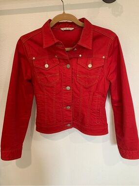 Bright Vibrant red CAbi jean jacket with button-front closure. Flap chest pockets and stitched detailing. Slim, structured silhouette for easy layering. Excellent condition.