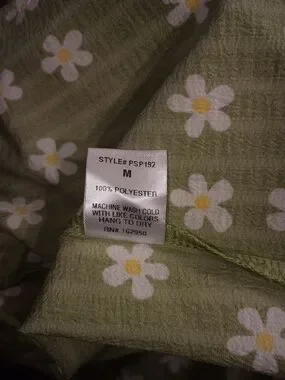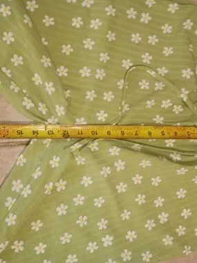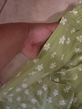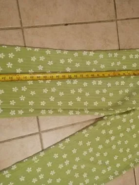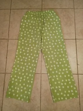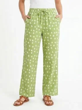 Comfortable green wide-leg pants with an allover white floral print. Elastic drawstring waist for a customizable fit. Lightweight, breathable fabric ideal for everyday wear. Side pockets provide practical storage.