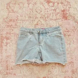 Trendy light wash denim shorts. Frayed hem for a casual look. Perfect for everyday wear.
