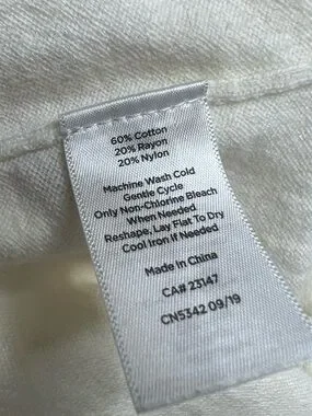 Cream knit sweater with a bold red heart on front. Navy striped yoke and crew neckline. Soft, casual style perfect for layering.
