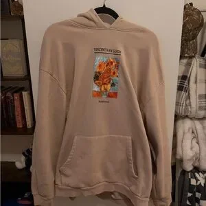 branded men's hoodie in beige with a Sunflowers graphic on the chest. Soft, casual fleece fabric for everyday comfort. Front kangaroo pocket and attached hood for added warmth. Beige color pairs easily with neutral and denim styles.