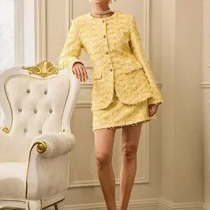 Elevate your style with this vibrant multicolor jacquard jacket and skirt suit, perfect for casual late fall outings. Featuring a round neck, long sleeves, and a regular fit, this suit offers both comfort and fashion. The lined jacket and unlined skirt combination provides a balanced look, while pockets add practicality.