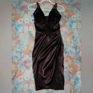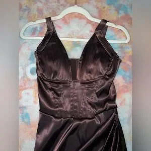 Chic satin corset dress with a plunging V-neck. Side slit adds a flirty touch. Sleek brown finish for evening wear. Pair with heels or a clutch.