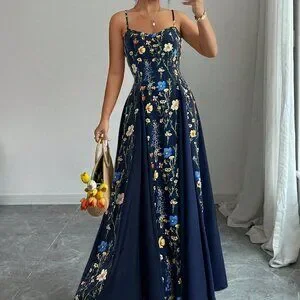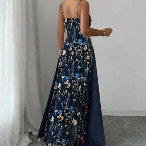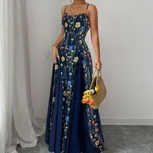 This navy blue boho maxi dress blends elegant style with a relaxed vibe, featuring a sleeveless cut, spaghetti strap and subtle puff‑sleeve detailing. A high waist and slim‑fit silhouette create a flattering shape, while the flared hem adds movement. The long length showcases a vibrant plant‑inspired floral pattern, making it perfect for garden parties, beach outings or casual evenings. Crafted for effortless chic, the dress offers a timeless, breezy look.