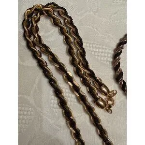This set includes a vintage signed Trifari gold-tone and black bead twisted rope chain necklace featuring gold-plated metal links intertwined with tiny black seed beads, as well as a matching bracelet ( although does not state designed by Trifari)