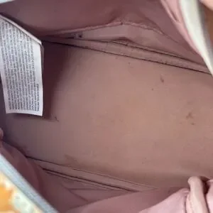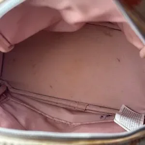 Does have some drawn marks in quite a few spots of the exterior. Have not been able to get them out myself. Light staining on the inside from use. Straps and bag structurally in great shape. See photos for details.