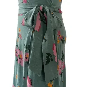 This green dress with a vibrant floral pattern from Toad & Co features a faux wrap design with a tie waist, cap sleeves, and side slip pockets.