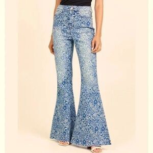 Altard State blue floral flare jeans in a bold bell-bottom silhouette. Features an allover white floral print, high-rise fit, and dramatic wide flare leg for a statement 70s-inspired look. Soft denim with stretch for comfort. New with tags (brand tag attached, no retail price tag).