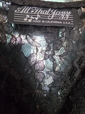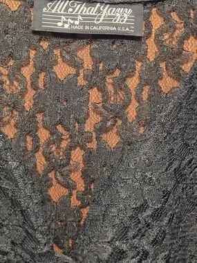 This is a stunning vintage long sleeve sheer lace maxi with a fitted bodice and flowing skirt by All That Jazz. Chrystal like buttons down the front with corset tie detail in the back. Sheer lace with slight stretch. Timeless black for evening or formal wear. This is a vintage piece that looks brand new with no defects. The approximate unstretched measurements;