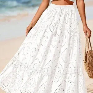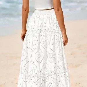 White Boho Women's Tiered Flowy Maxi Skirt with Lace Embroidery