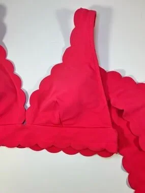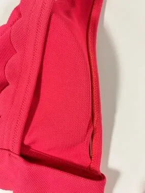 V-neck bralette bikini top with scalloped edge. Removable pads. Missing tags - size medium. Smooth textured fabric in bright pink coral. Bottoms have scalloped edge, high waist. Medium coverage. Size medium.