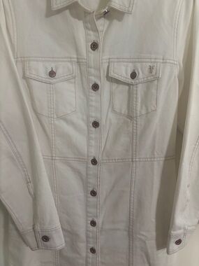 White Frye mini denim dress with long sleeves and side pockets. Button-front closure with contrast stitching. Chest flap pockets and collar. Clean, minimal design. Versatile for daytime or evening wear.