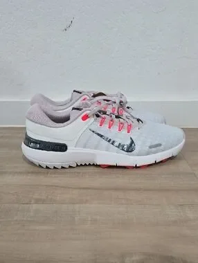 Light gray Nike athletic shoes with breathable upper. Cushioned sole for everyday training. Pink eyelet and insole accents for a pop of color. Flexible outsole for natural movement.