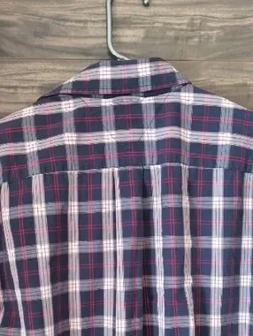 Elevate your summer wardrobe with this authentic vintage Tommy Hilfiger short sleeve button-down. Featuring a timeless navy, red, and white plaid pattern, this shirt is made from high-quality 100% cotton for a breathable, comfortable fit.