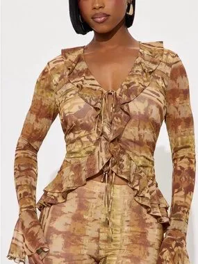 Stylish flared pants in a brown and cream tie-dye print. Soft, stretch fabric for comfortable all-day wear. Versatile design pairs easily with fitted tops or blouses. Features a high-rise waist and a long, flowing leg for a flattering silhouette.