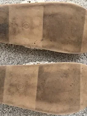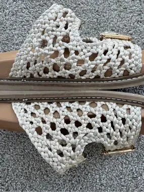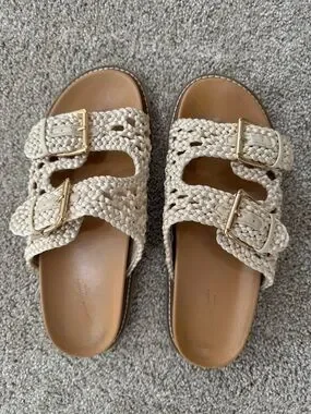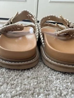 Braided cream straps with two adjustable buckles. Smooth tan footbed for comfort. Gold-tone buckles add a polished accent. Easy slip-on style for casual wear.