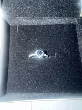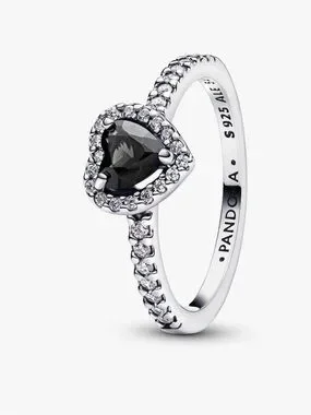 Pandora ring in sterling silver. Heart-shaped black center stone framed by sparkling pavé. Shimmering band with crystal accents. Sleek, romantic design for daily wear or gifting.