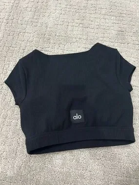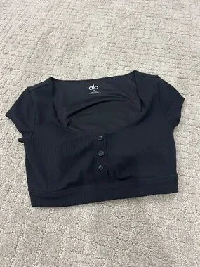 ALO Yoga Black Ribbed Button-Front Square Neck Crop Top