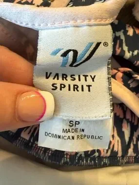 Varsity Spirit athletic sports bra in a stylish pink, navy, and light blue patterned design with racerback straps. Supportive and comfortable—perfect for cheer practice, workouts, or activewear layering.