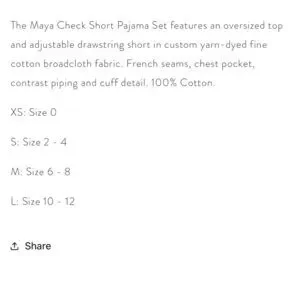 Marigot Maya Check Short Pajama Set Pink Plaid Pajama 100% Cotton XS