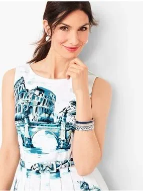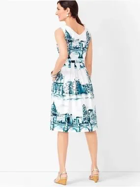 Sleeveless fit-and-flare silhouette. Scenic architectural teal print on a white base. Defined waist and full skirt. Elegant day-to-evening style.