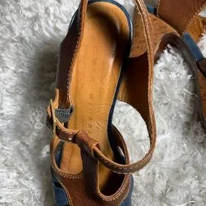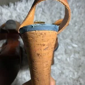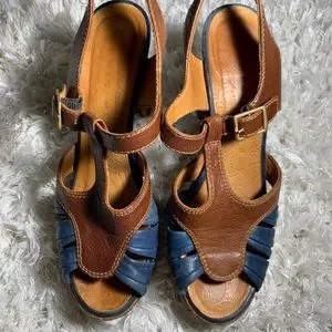 Cork platform heels with mixed leather straps. Blue leather toe detail and brown upper straps. Adjustable buckle for a secure fit. Pre loved condition. These photos are of original listing. Made in Spain.