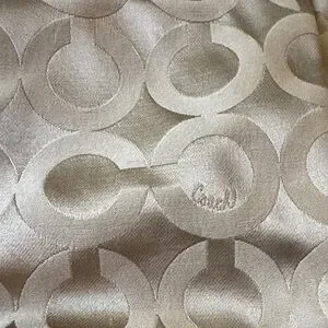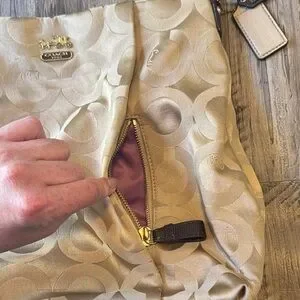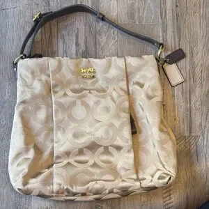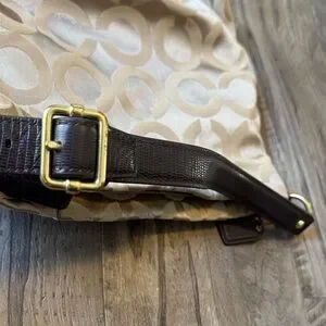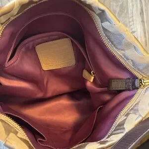 Chic Coach shoulder bag in beige with brown accents. Features signature pattern and gold hardware and purple interior. Ideal for everyday use.