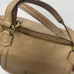 Stylish tan leather shoulder bag by Coach. Features gold hardware and a front buckle detail. Perfect for everyday use.