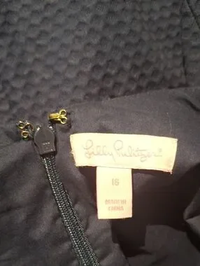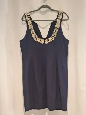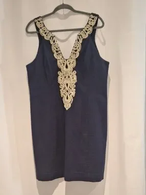 Lilly Pulitzer Navy Shift Dress with Gold Lace V-Neck Trim Size 16