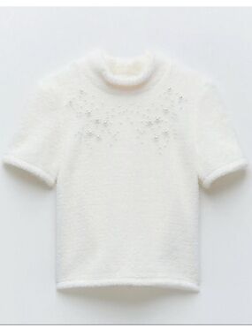 Zara White Pearl-Embellished Fuzzy Mock Neck Sweater