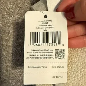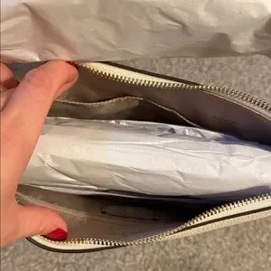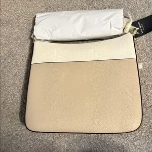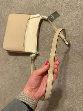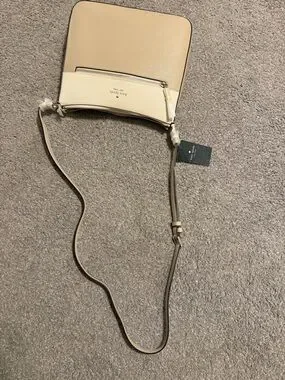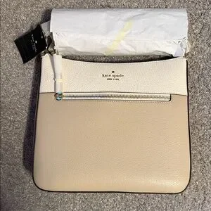Elegant crossbody bag by Kate Spade. Features a two-tone design with a front zipper pocket.