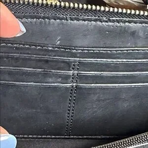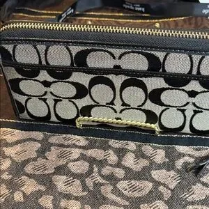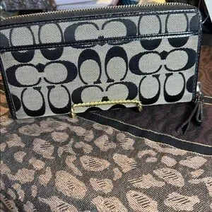 Coach canvas wallet with iconic 'C' pattern. Front leather logo patch. Zip-around closure. Sleek neutral color scheme. Interior is mirrored design: each side has back bill slot, 6 CC slots then zipper compartment for change and next side is same as first side with a separated piece. Nice size wallet that holds a lot. Measures 8” wide, 4” tall and 1“ deep. Holds 12 CC’s and lots of room for big wads of cash! Fancy Coach Emblem on front informing us that Coach established in 1941. Very Chic❣️Thanks for looking💜🌟