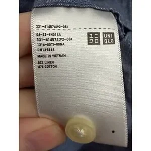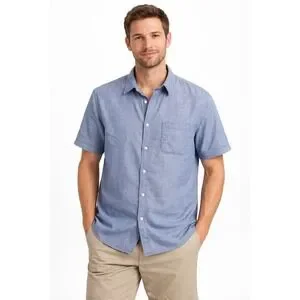 Uniqlo short sleeve button down shirt crafted from a breathable linen and cotton blend. This lightweight top features a classic collar, a single chest pocket, and a subtle chambray-like texture in a versatile blue hue. The natural fabric blend provides a cool and comfortable feel, making it an ideal choice for warm weather styling. Finished with tonal buttons and a standard fit.