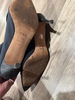 Sleek black sock-style boots with a pointed toe. Decorative knotted leather detail at the vamp. Slim heeled silhouette for a refined look. Stretch upper offers a close fit.