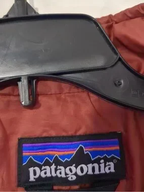 Red. Lightweight jacket with stitched Patagonia logo. Quilted fabric with zip-front style. Bright multicolor logo stripe detail. Casual outdoor look.