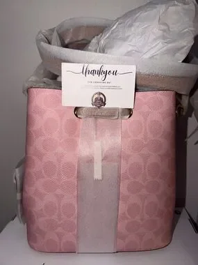 Stylish Coach bucket shoulder bag in soft pink signature print. Gold-tone hardware details add subtle shine. Single shoulder strap for comfortable wear. Clean, modern silhouette suited for daily use.