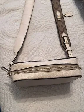 Compact pebble leather crossbody in chalk. Features a contrasting Coach signature adjustable strap. Polished hardware and subtle Coach logo plaque. Clean silhouette ideal for everyday wear.