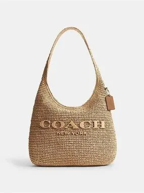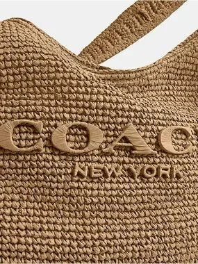 Signature COACH logo across the front. Woven straw construction with a single shoulder strap. Leather hang tag detail. Casual, sun-ready silhouette.