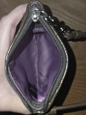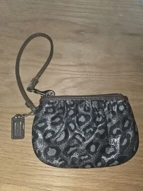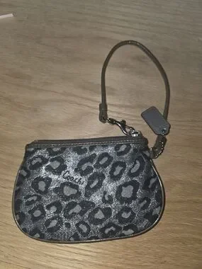 Coach wristlet with metallic leopard jacquard. Compact shape with zip top. Wrist strap for hands-free carry. Signature Coach tag detail.