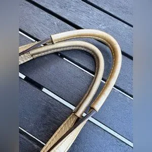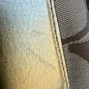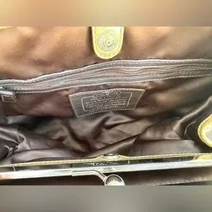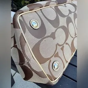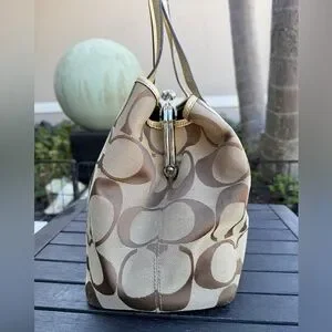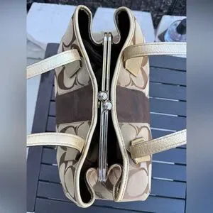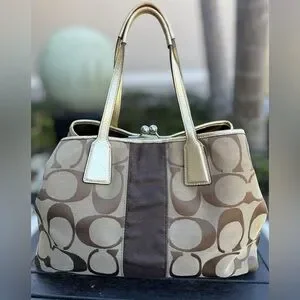 Classic Coach signature canvas tote. Features brown and tan logo pattern. Gold metallic handles and accents. Central dark brown panel detail. Top kiss-lock closure. Structured carry with roomy interior. Stylish everyday bag.