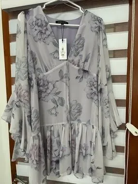 Sheer lavender chiffon with floral print. V-neck with delicate tie closure. Flowing tiered hem and flutter sleeves. Lightweight, airy drape for feminine style.