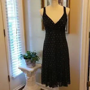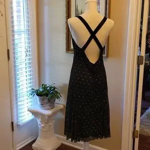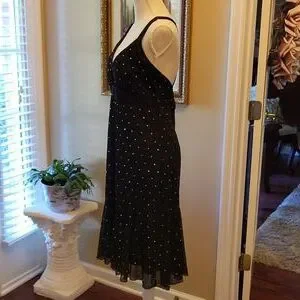 R&M Richards black halter dress built in bra silver sequins. Empire waist. Criss-cross back. Sheer textured overlay with full lining in black. A line skirt with wide ruffle at hemline. 100% polyester. approximate 12P. Approximate measurements 20" from pit to pit. 16" across waist. 22" across hips. Excellent pre owned condition. Smoke free and pet free home