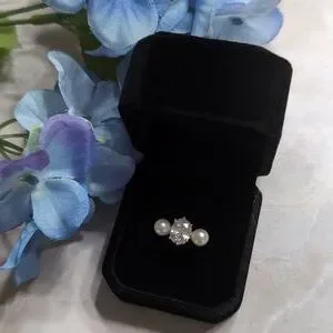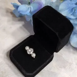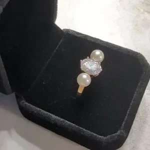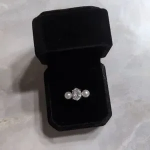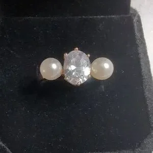 This Charter Club elegant ring features a stunning sparkly crystal flanked by two lustrous imitation pearls. Perfect for adding a touch of sophistication to any outfit. Size 7. This was a Macy's Return with no box. I will send in new black velvet ring box as shown. NWOT. Retails at $29.50. Ring is in excellent condition.