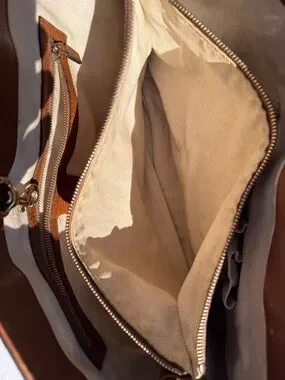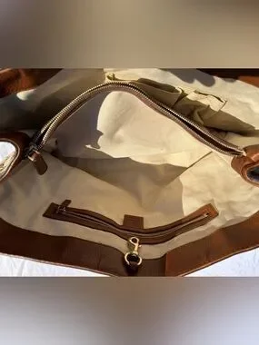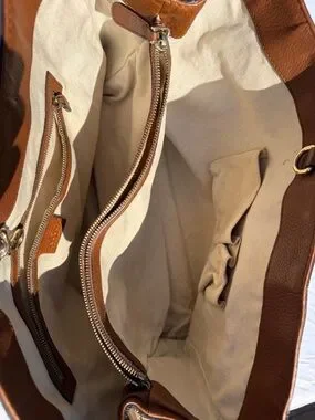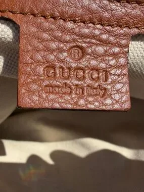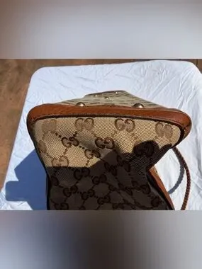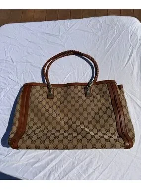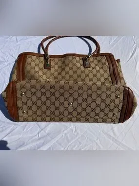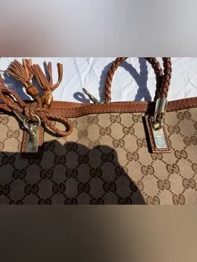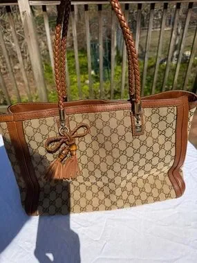 Classic Gucci Bella monogram canvas tote. Brown leather braided handles and trim. Decorative leather tassel accent. Open top with roomy interior. Versatile everyday luxury.