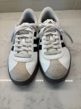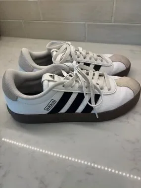 Classic adidas low-top sneakers with white leather upper. Black three-stripe branding on sides. Gum-colored rubber outsole for grip. Padded collar and lace-up closure for comfort.